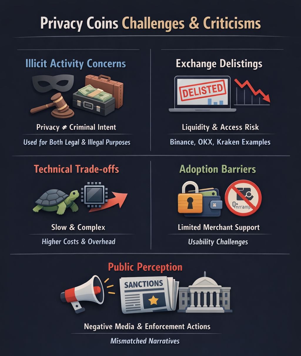 Privacy coins address real problems, but they come with trade-offs that are often overlooked in bullish narratives. This section deals with the main criticisms directly, without moral panic or marketing spin.