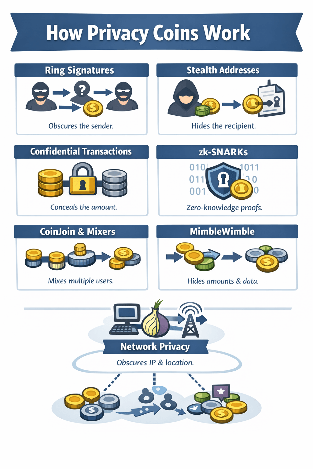 On networks like Bitcoin or Ethereum, anyone can see transaction amounts, sender addresses, recipient addresses and timing. That openness makes verification easy, but it also makes surveillance cheap. Privacy coins change this by limiting what observers can learn, even if they can see the blockchain.