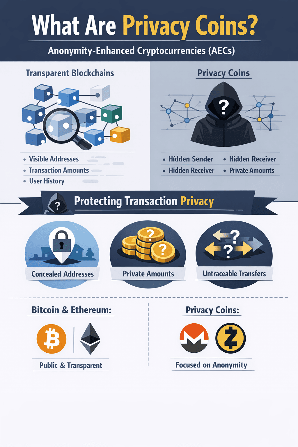 Privacy coins are cryptocurrencies designed to hide transaction details that most blockchains expose by default.