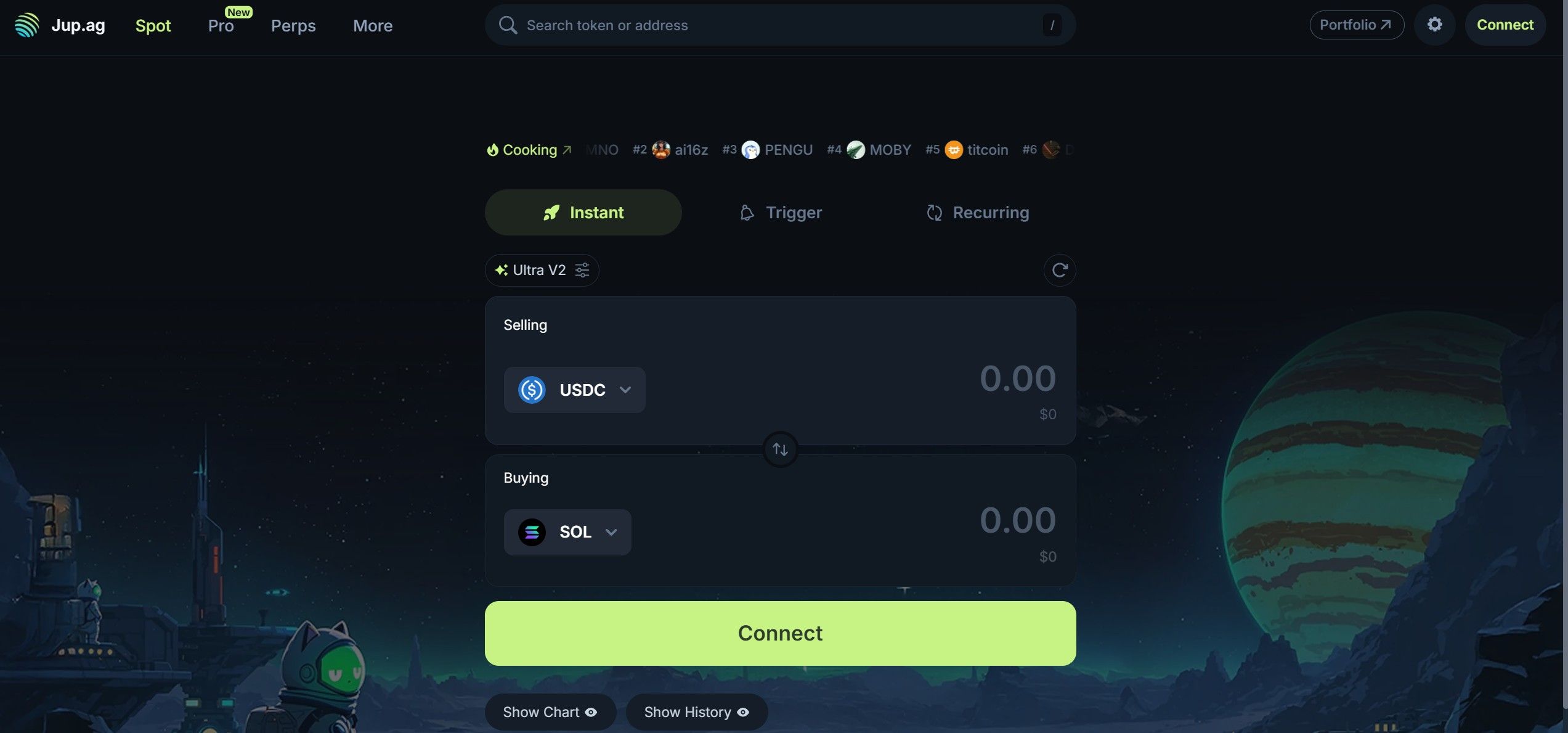 - UX: Supports Phantom, Solflare, and Ledger wallets with a clean, mobile-friendly V3 interface and click-to-swap execution.