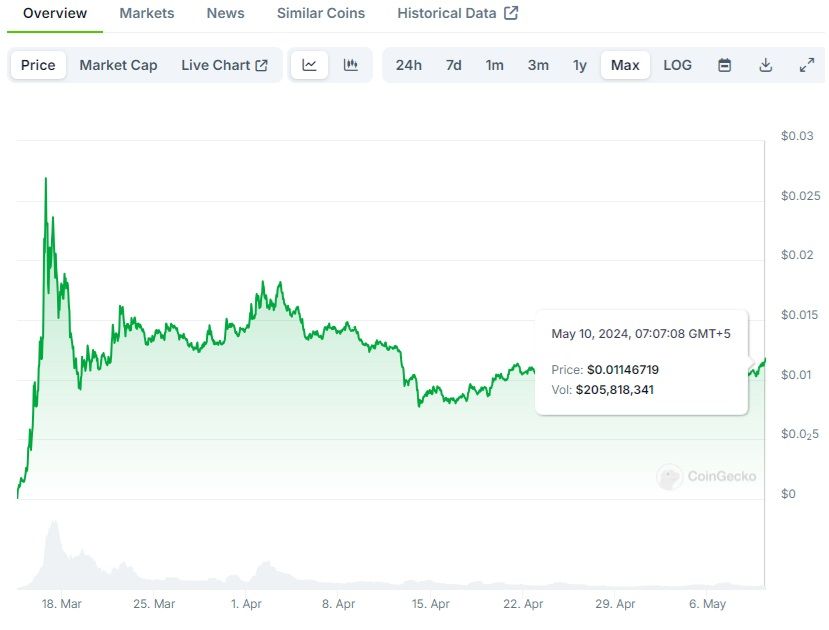 Book of Meme burst onto the scene in March 2024, experiencing an astonishing 3,000% surge in value shortly after its launch. Created by Darkfarms, the mind behind Pepe, the token aims to create a permanent storage library for meme coins using Arweave, IPFS, and inscriptions, doubling as a social platform for cross-chain storage.