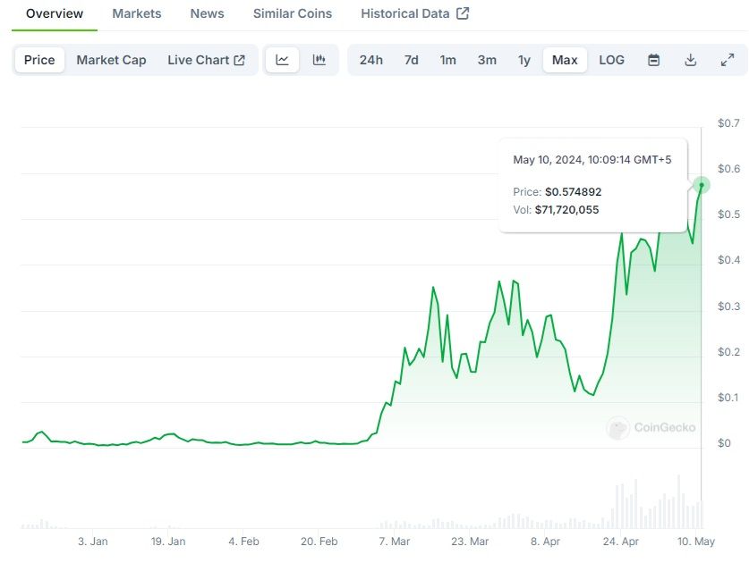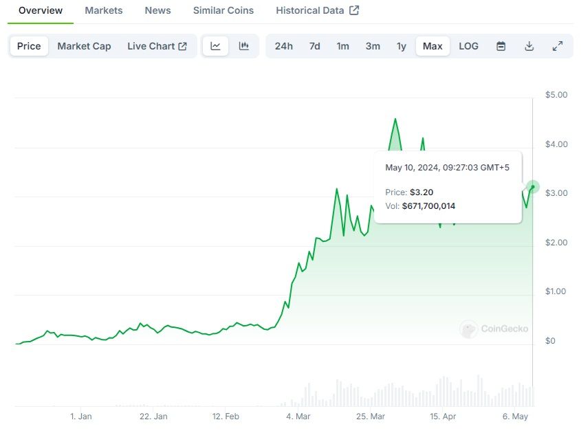 Since its debut in December 2023, this dog-themed token has been fetching quite the price, reaching a peak of around $2.25 on March 8, 2024. And when Binance announced it would list the token, every investor threw a bone to Dogwifhat, taking its market capitalization to nearly $2.2 billion and making even the fluffiest of Shiba Inus jealous!