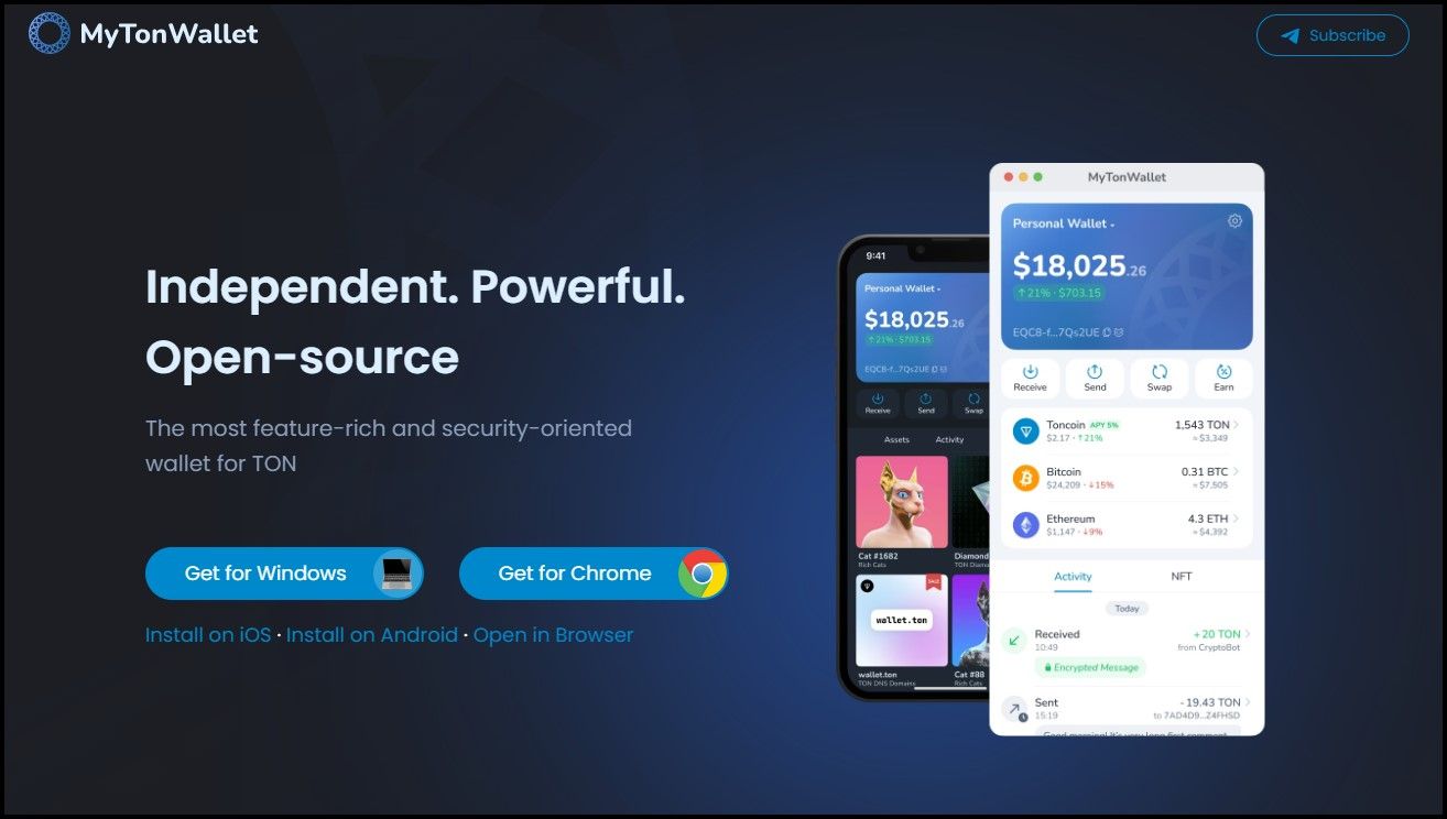 MyTonWallet is an open-source, non-custodial wallet for the TON network, which means its codebase is available publicly for development and auditing, ensuring transparency and trust. The wallet supports many functionalities, including multi-account management, staking, NFT handling, and DApp connectivity. It's a popular choice for new and experienced users in the TON ecosystem.