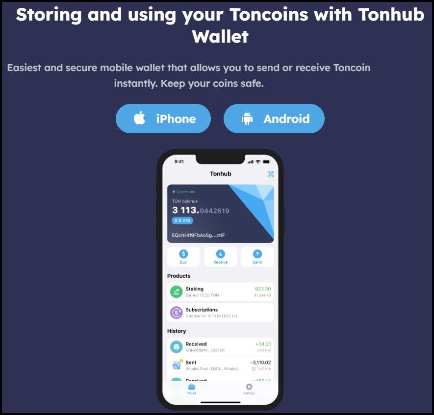 Tonhub is a Mobile-Only Wallet. Image via TonhubUser Experience: The wallet provides a minimalistic and user-friendly interface, making it highly accessible for new users. Its simple onboarding process (no KYC required) and mobile-centric design make managing crypto on the go a smooth experience. However, it is currently only available on mobile devices (iOS and Android), which may limit its appeal to desktop users.