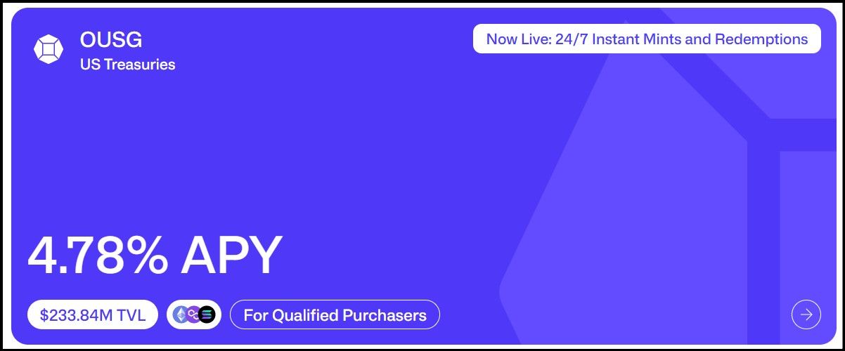 The OUSG Fund APY. Image via OndoThe OUSG Fund provides tokenized on-chain ownership of BlackRock's iShares Short Treasury Bond ETF. This product offers liquid exposure to short-term U.S. Treasuries, which are considered low-risk investments. The process involves users depositing USDC or USD, which is then used to purchase the underlying assets. The fund has attracts a 0.15% management fee from Ondo, alongside intermediary and BlackRock fees. However, due to SEC regulations, access is restricted to accredited investors and qualified purchasers, making it less accessible to the average DeFi participant.