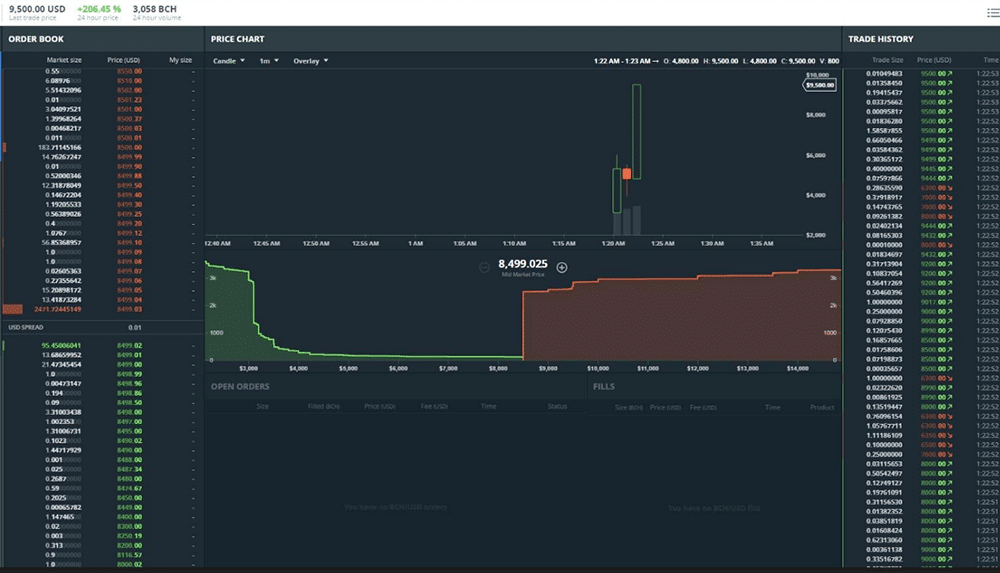 This was also on demonstration to a large degree in the Bitcoin Cash fiasco. Looking at the below screenshot from GDAX, you can see the price of BCH jumped very quickly on the orders.