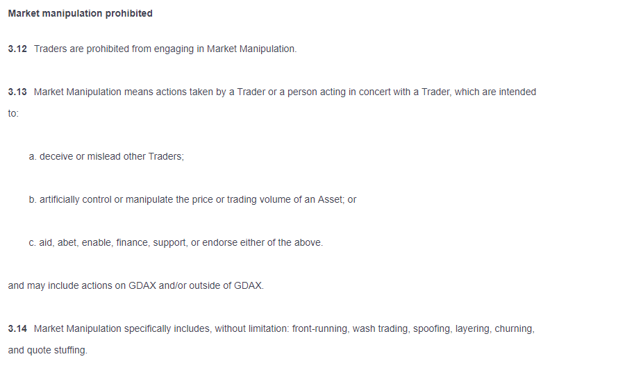More particularly, actions designed to manipulate the market are prohibited on Coinbase. Given that it was really unlikely that these trades were actually completed by a human trader, Coinbase should investigate the accounts.