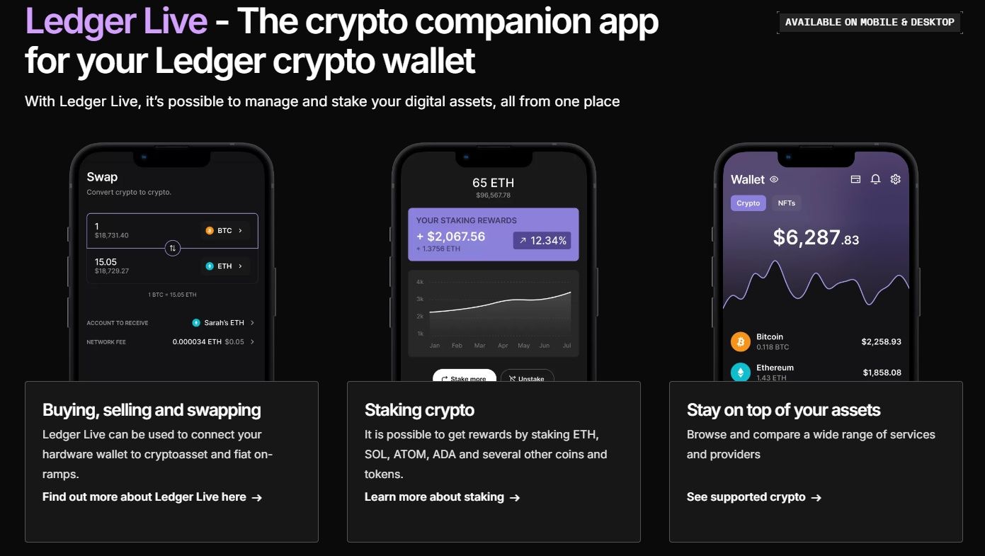 One of Ledger’s standout features is the Ledger Live app, available on both desktop and mobile. This app serves as a one-stop shop where users can manage their portfolio, check balances, and even buy or swap crypto. Ledger also supports staking directly from Ledger Live for coins like Tezos (XTZ) and Ethereum 2.0, giving users the ability to earn passive income on their holdings.