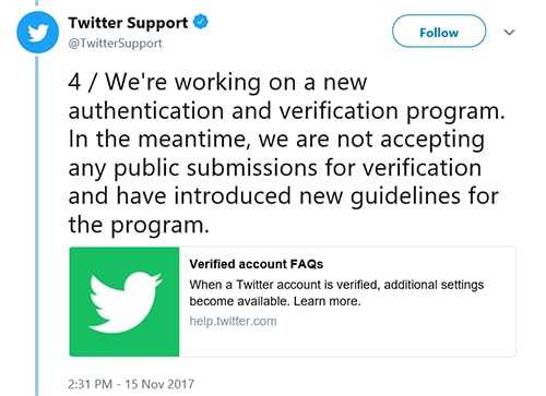 Twitter suspended public requests for verification all the way back in November 2017 as evidenced by a tweet from @TwitterSupport: