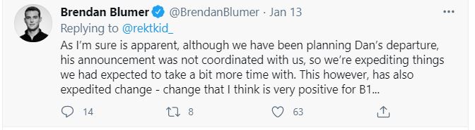 Blumer on Dan Larimer’s departure. Image via Twitter The SEC accused Block.one of conducting an unregistered token sale during its 2018 ICO and fined the company £24 million dollars, Although this seems a hefty sum, it represents a tiny fraction the funds raised, while the SEC did not levy any other penalties on either Block.one or any of its employees. Contrast this with the recent Ripple lawsuit, which has seen the SEC go after both Ripple and three of its highest-ranking staff.