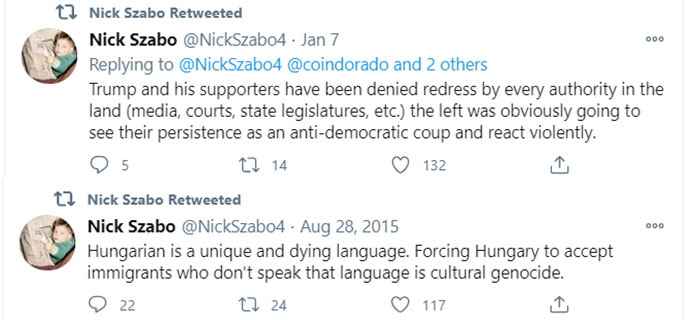 Nick Szabo's Tweets. Image via Twitter This attitude shows a dichotomy at work in the crypto community. While it is united in seeing BTC and its altcoin descendants as a path to financial freedom and an escape from governmental control, the same political divisions that are present in wider society are just as deeply embedded here.