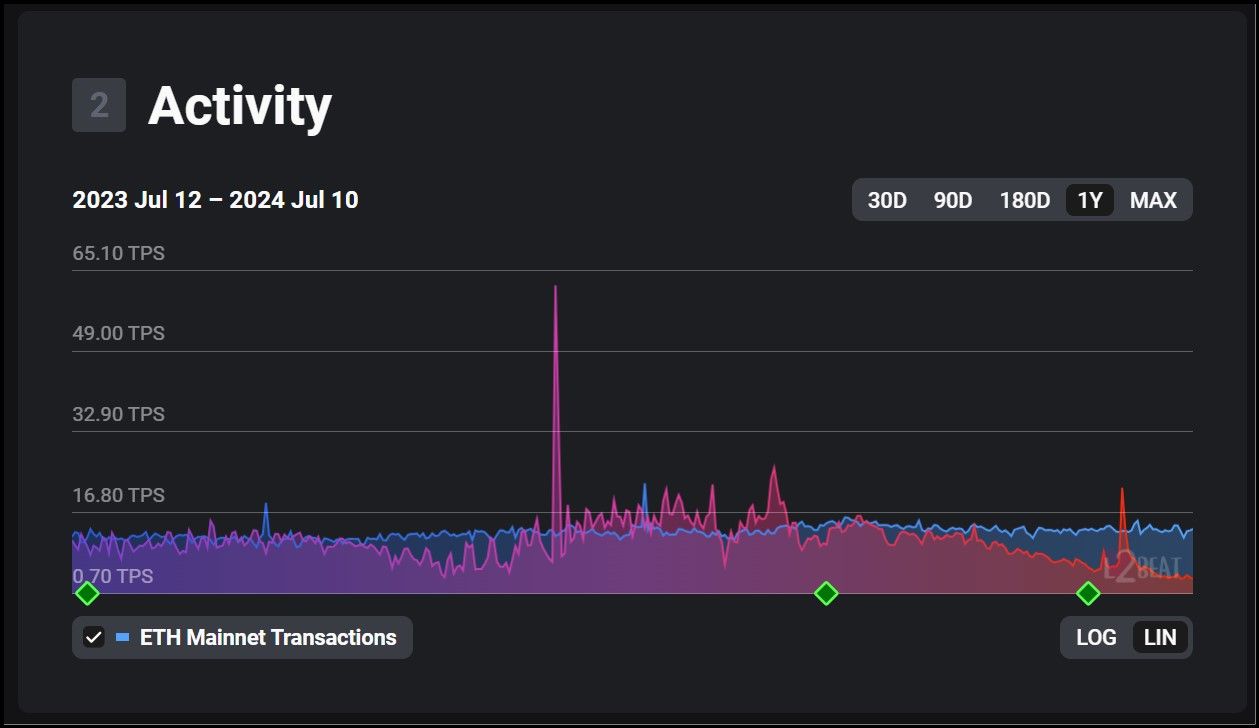 ZKsync On-Chain Data via L2BEATZKsync Era: ZKsync Era also averages around 12 TPS, but these transactions are a balanced mix of Ethereum and Layer 2 application transactions.