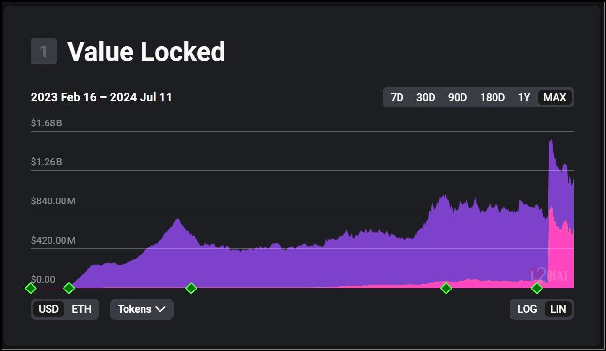 ZKsync On-Chain Data via L2BEATZKsync Era: The TVL for ZKsync Era is significantly higher at $1.11 billion, with a peak of $1.6 billion in June 2024.