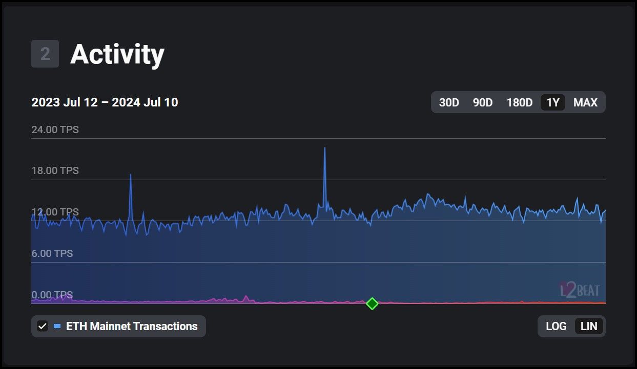 Plygon zkEVM On-Chain Data via L2BEATPolygon zkEVM: This network sees an average transaction rate of 12-14 transactions per second (TPS), predominantly Ethereum transactions with minimal Layer 2 application activity.