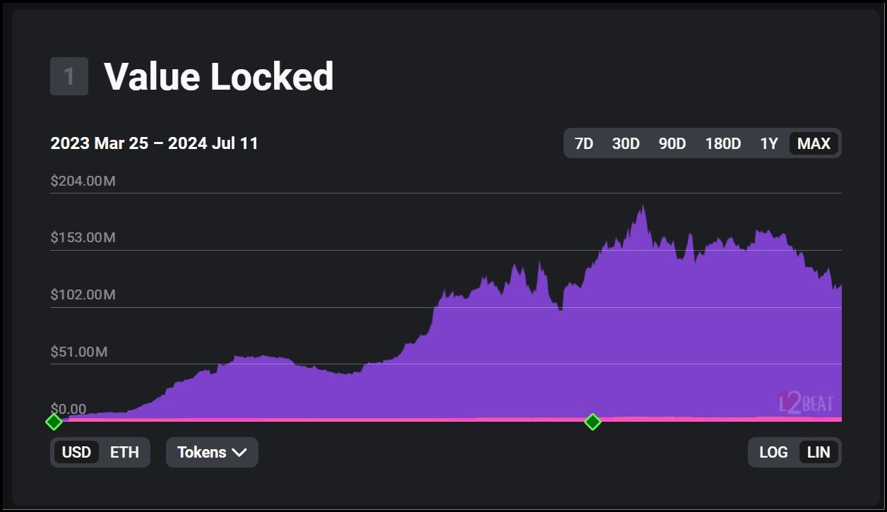 Plygon zkEVM On-Chain Data via L2BEATPolygon zkEVM: The TVL for Polygon zkEVM stands at around $120 million, with a peak of $190 million in March 2024.