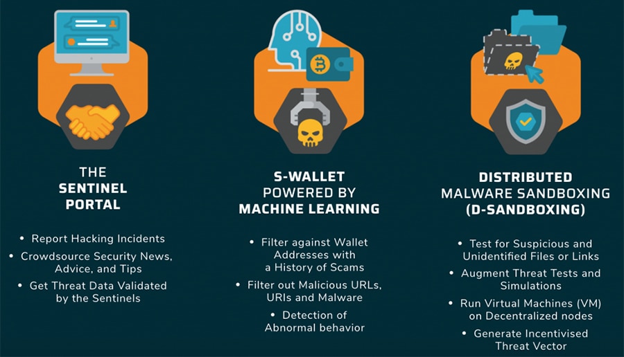 Sentinel protocol provides 3 main security features: The Sentinel Portal or Threat reputation database (TDRB), Machine-learning engine integrated security wallet (S-wallet), and a distributed malware analysis sandbox (D-Sandbox).