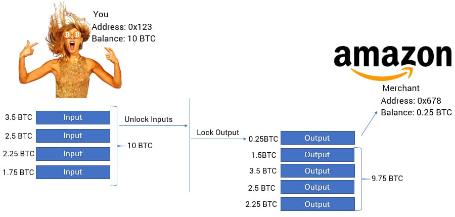Example of a Bitcoin transaction with unspent Output. Images from Shutterstock and AmazonInstead, the wallet will send the 1.75 BTC UTXO and the Bitcoin network will take that and mint two new UTXOs. One will be valued at 0.25 BTC and go to the Amazon receiving wallet, and the other will be valued at 1.5 BTC and will go back to your wallet as change.