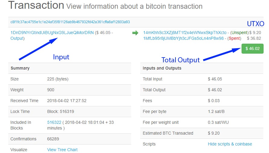 Example of UTXO, spent & unspent transactions on blockchain.comAs you can see, the total input to the transaction is $45.19. There are two outputs which are the $36.13 spent output (going to the 1MfLb95r8jUMBbYjh3cJFGs5oLn4nP8w98) and the $9.02 unspent output which is being sent back to the sender.