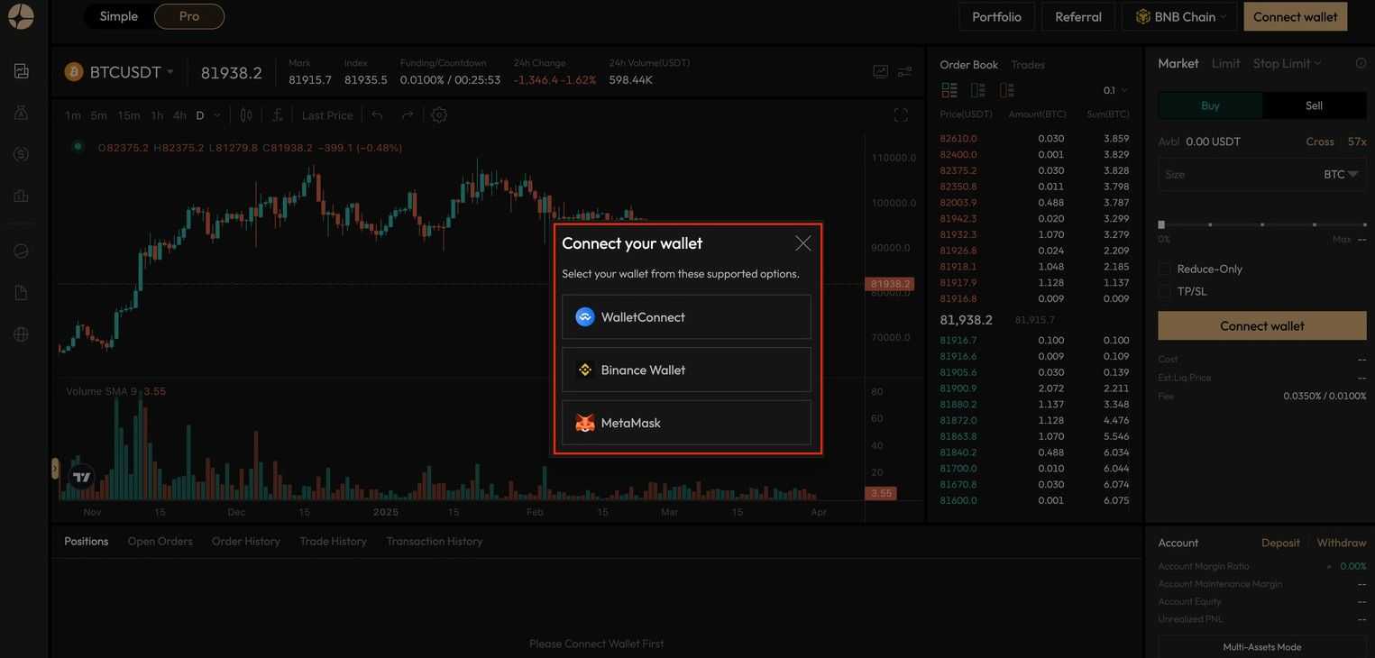 Choose MetaMask or Binance Wallet, or select WalletConnect to link other supported wallets.