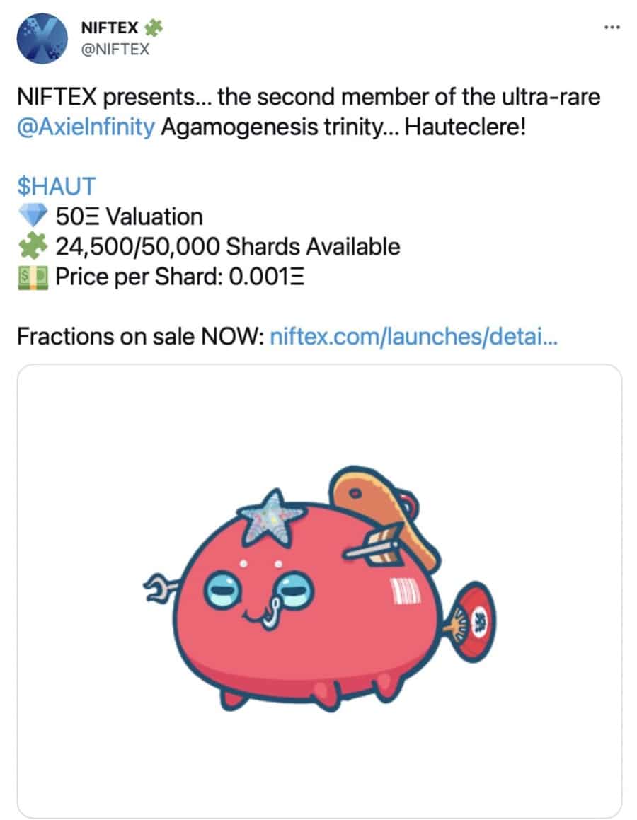 Ultra-Rare Axie Infinity NFTs Were Sharded And Sold On The Niftex Platform - Niftex Twitter Another interesting project looking to pioneer the fractionalised NFT trend is Fractional. Fractional is a decentralised protocol enabling NFT owners to mint tokenised fractional ownership of their NFTs as ERC-20s, with each fraction acting as governance on the underlying ERC-721 asset.