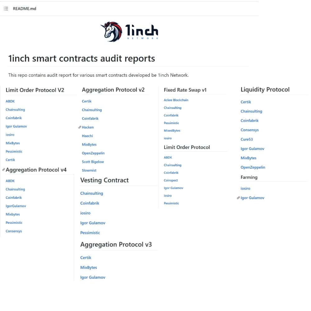 A Look at The Multiple Audits Conducted on the 1inch DeFi Application. Image via github/1inch-audits.Blockchain auditing companies will have a team of engineers that can conduct tasks such as: