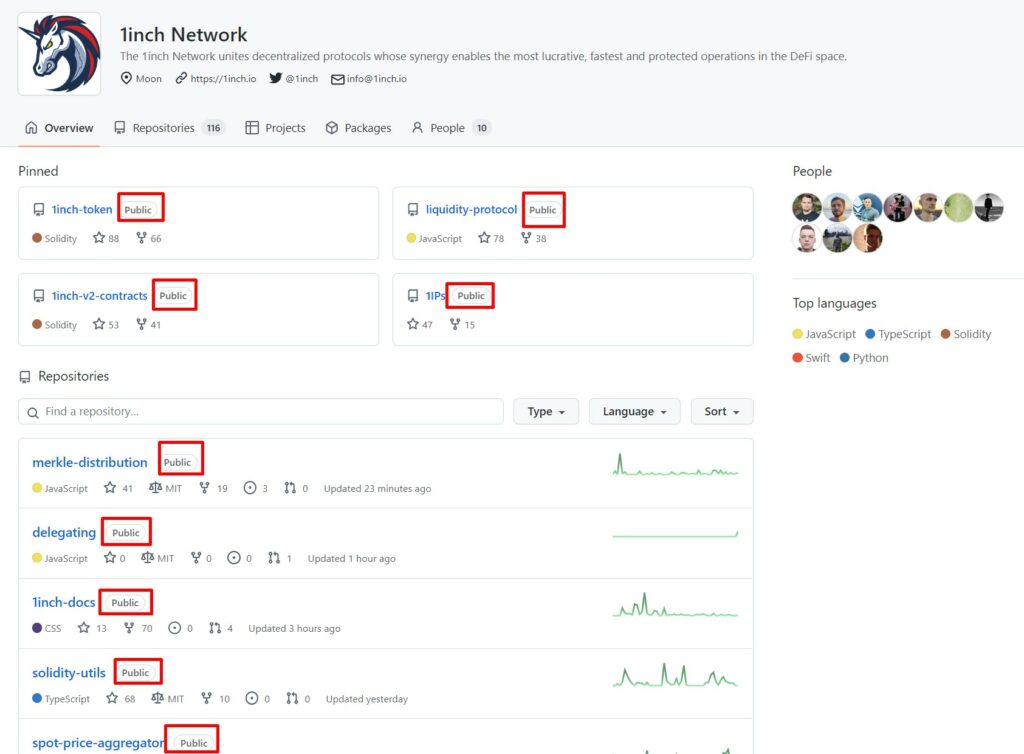 When looking at a project’s GitHub page, this is often one of the things that users who are considering using a DApp look for, using 1inch again as an example: