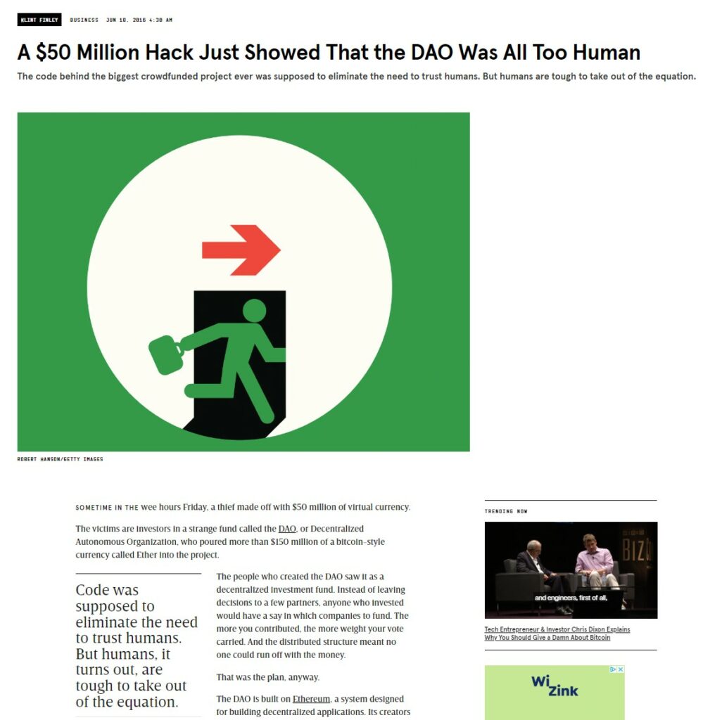 The Infamous Ethereum DAO Hack. Image via WiredEssentially, what happened here was something known as a re-entrancy bug. To put it simply, the code executes two instructions: