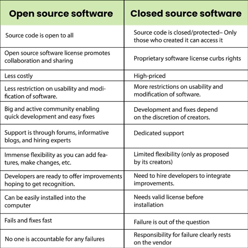 Here is a great visual from Bridge Global that summarizes some of the generalized differences between open-source and closed-source software: