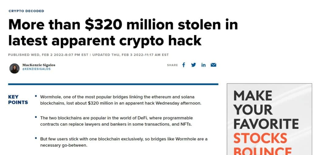 Solana Wormhole Hack. Image via CNBC2022 did not get off to a good start with the first major attack happening on Solana in early February. The attacker bypassed a signature verification in a Rust program so it looked like the guardians had signed off on a 120k ETH deposit into Wormhole on Solana, even though they hadn't. The attacker then minted 120k worth of wrapped ETH on Solana.