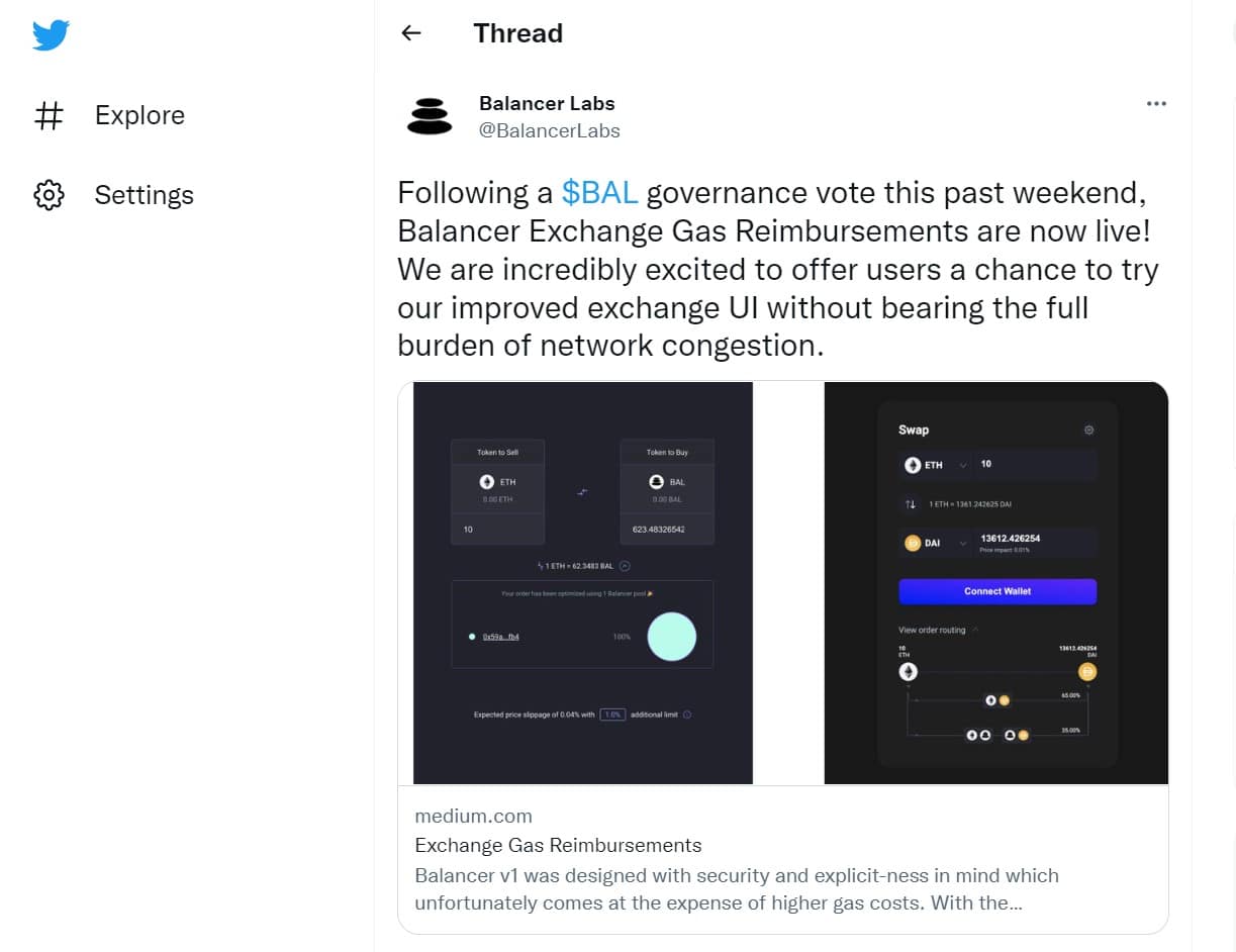Balancer Announces Gas Reimbursements to Battle Ethereum Gas Fees Image via twitter.com/balancer- Utilize Gas Tokens. Users can delete their storage variables on the Ethereum network and earn ETH as refunds for doing so. You can mint the gas tokens when the gas fees are low and redeem the gas tokens for ETH, which can be used to pay gas fees. You can learn about that process on gastoken.io