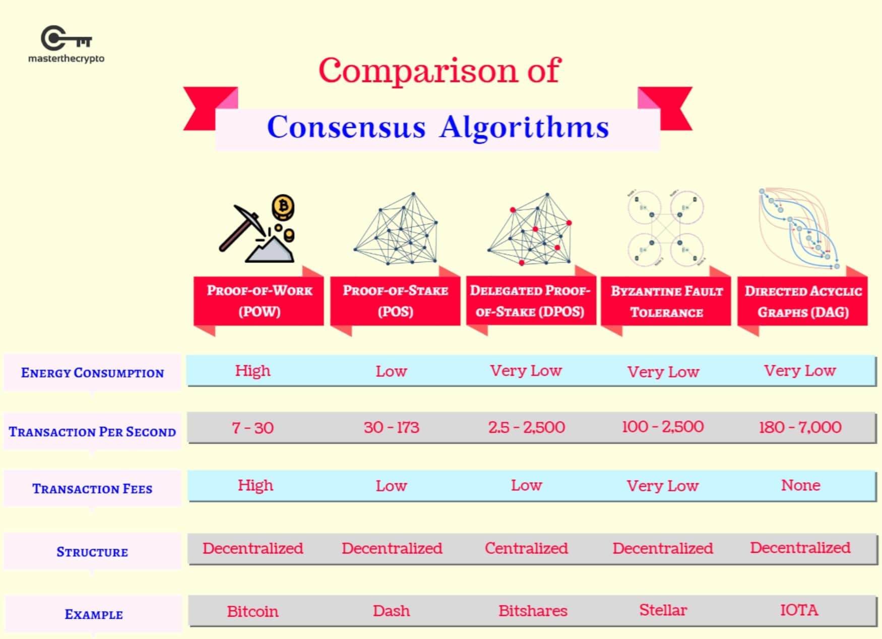 When a block of transactions is ready to be processed, the Proof-of-Stake protocol will choose a validator node to review the block. The validator checks if the transactions are accurate, and if they are, that block gets added to the blockchain and the validator node that validated and processed the transaction receives rewards for its contribution. Those rewards are made up by the network fees that go along with transactions. Proof-of-Stake transactions require much less computational power, so therefore the transaction fees are generally substantially lower. Here is a look at how some of the different consensus mechanisms compare: