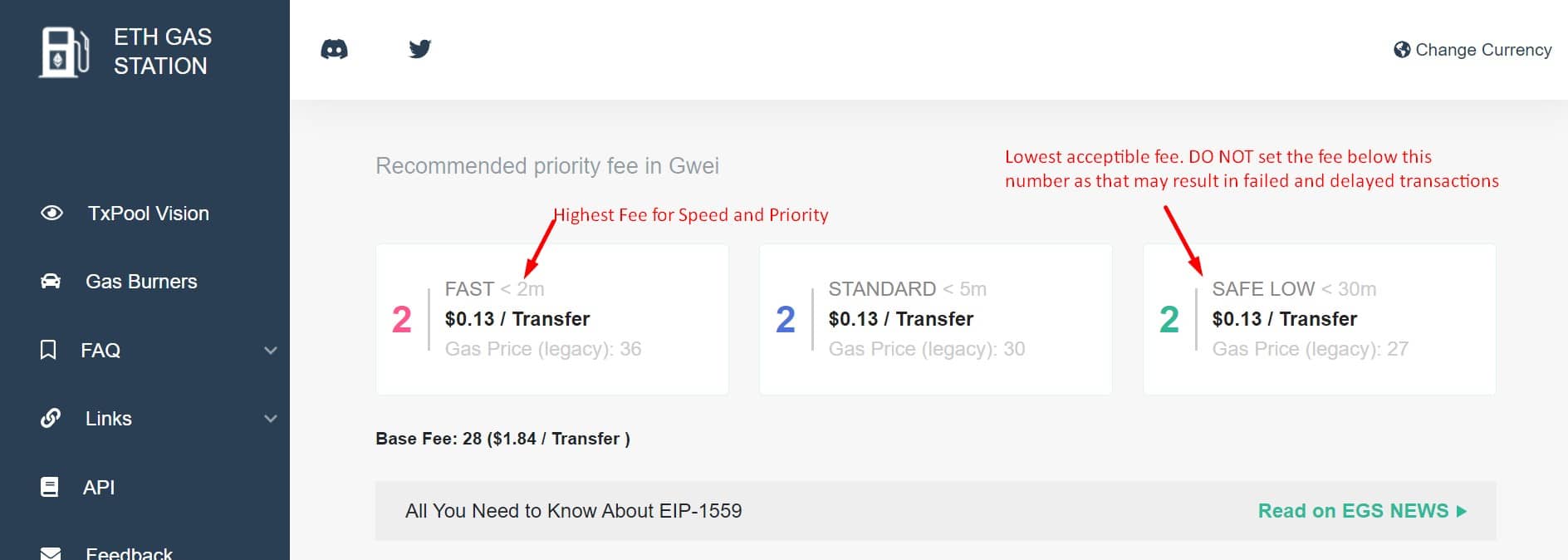 - First and foremost, timing is everything, similar to Bitcoin, except that high network traffic impacts Ethereum more severely. Take a look at a site like ethgasstation.info and look at the Gwei numbers. Gwei is short for giga-Wei and is a denomination value for Ethereum, akin to Satoshis for Bitcoin and cents for dollars. When this site is showing high numbers, the network is seeing a lot of traffic/congestion. The site gives three numbers to help you know how high or low to set your Ethereum gas fees. Fast on the left, which is the most expensive but will get the transaction done the quickest, standard, and slow for the penny pinchers, which will be the cheapest but also the slowest transaction time.