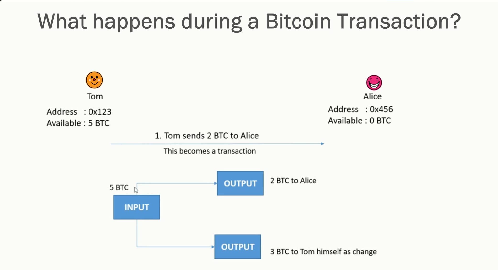 - Mind the inputs and outputs! Bitcoin transactions can be more expensive to send if the amount is made up of smaller inputs. Bitcoin network fees are proportional to the size of bytes in your transaction. Bitcoin utilizes an Unspent Transaction Output (UTXO) model, which means you receive BTC back like “change” back for transactions. So, if you own 5 BTC and want to send 2, your wallet sends the total amount, so 5, then 3 (minus network fees) would get returned to your wallet in what is known as a change address like so: