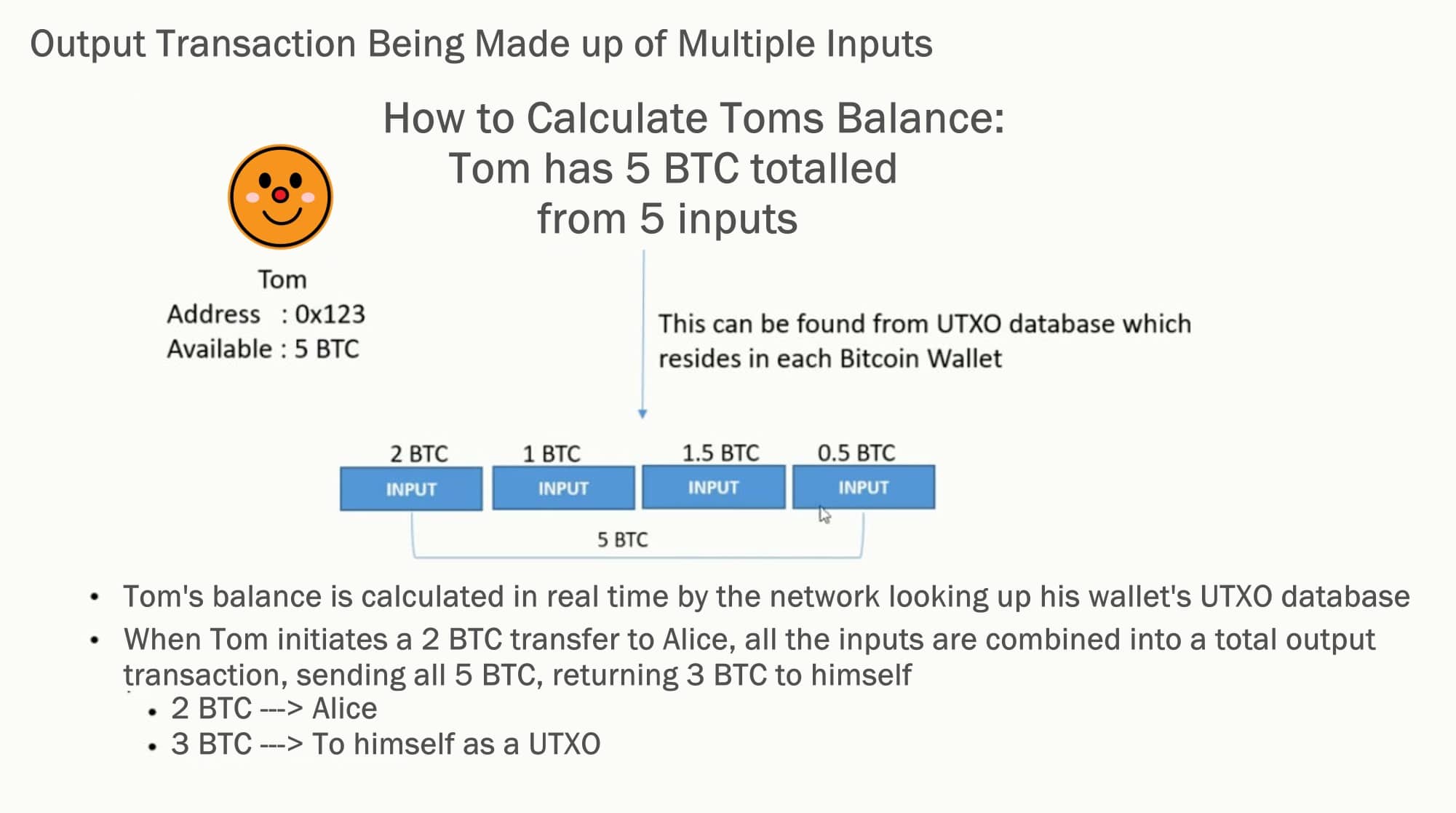 Another reason why all this is important is that if you receive multiple small Bitcoin transactions, then need to send one large transaction, the network will combine all the smaller input amounts you have received to make up the large output amount like this: