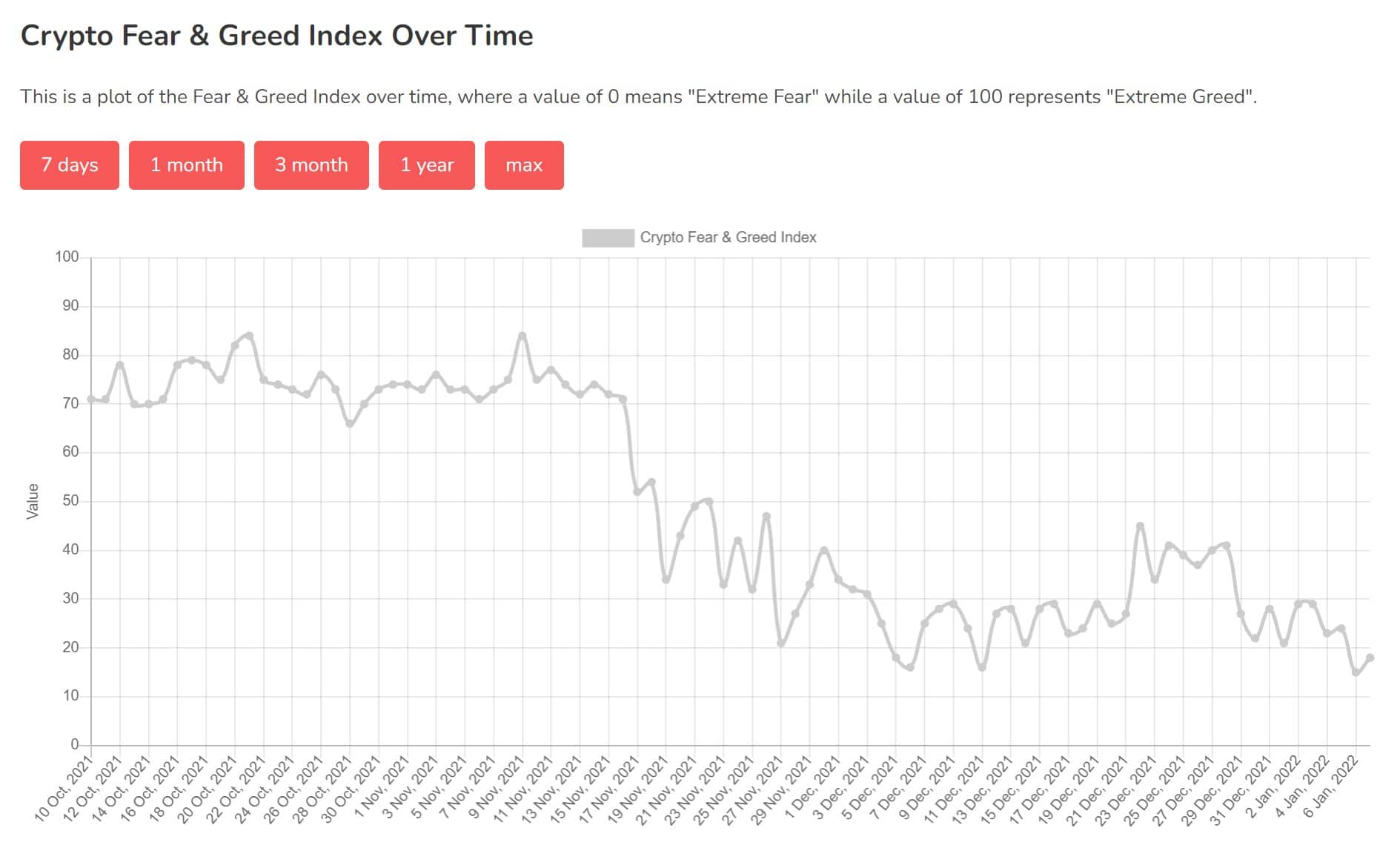 The Crypto Greed and Fear Index can be Analyzed Over Time Image via alternative.me With all that data, the index crunches the numbers into a simple meter from 0 to 100, with zero being extreme fear while 100 means extreme greed.