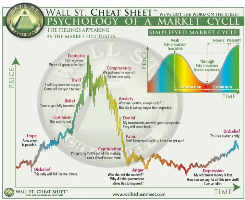 An Image Showing the Investor Sentiment Lifestyle. Watch Out for Euphoria, This is Where Investors Get Burned by Greed Image via q3tactical.com Buying into and holding past the Euphoria stage of investing is where the majority of investors get wrecked as their investment has been going well, they feel like geniuses as they are rich! (on paper) and they are so confident that their investment is going to the moon that they continue to hold and they may even start piling more money in here at this stage…No longer buying low, nor selling high, are they? And like all markets, the downturn is just around the corner and they were too greedy to sell.