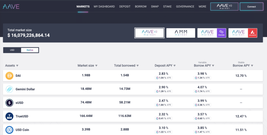 The second spot for lending on DeFi Pulse is AAVE. It's a "system of lending pools" where depositers can lend their crypto assets into pools, governed by smart contracts, in exchange for earning interest. Starting life on the Ethereum blockchain, it has branched out to be available on the Polygon and Avalanche blockchains.