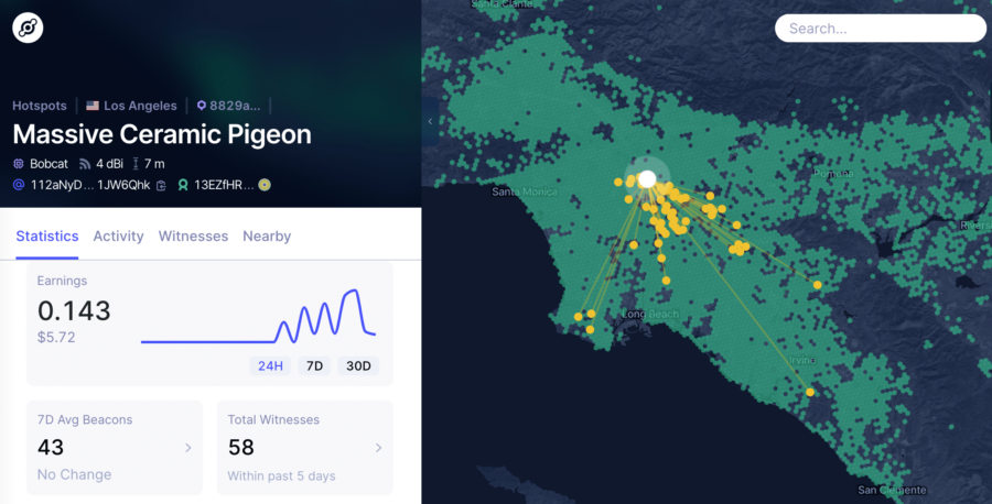 Loads of hotspots in LA with some stats of one miner Image via Helium Explorer Scan There is a balance between the number of miners and the number of users in an area to generate the optimum amount of return. Miners act as either Witnesses, Challengers, or Transmitters at any given time. Here are some stats for reference: