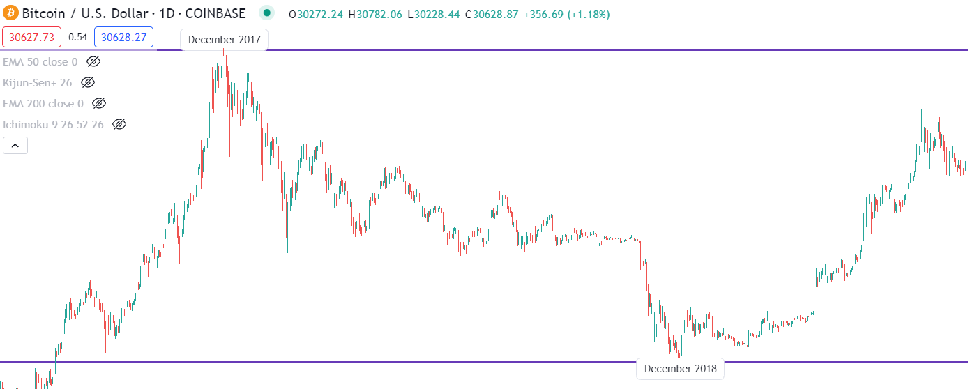 As a novice trader, you could have felt biased towards the next move for ETH/USD, imagining the price bouncing off support and ascending back into the range. However, the price movement determined that the support line changed. It became a resistance level as the price retest failed to gain momentum several months later.
