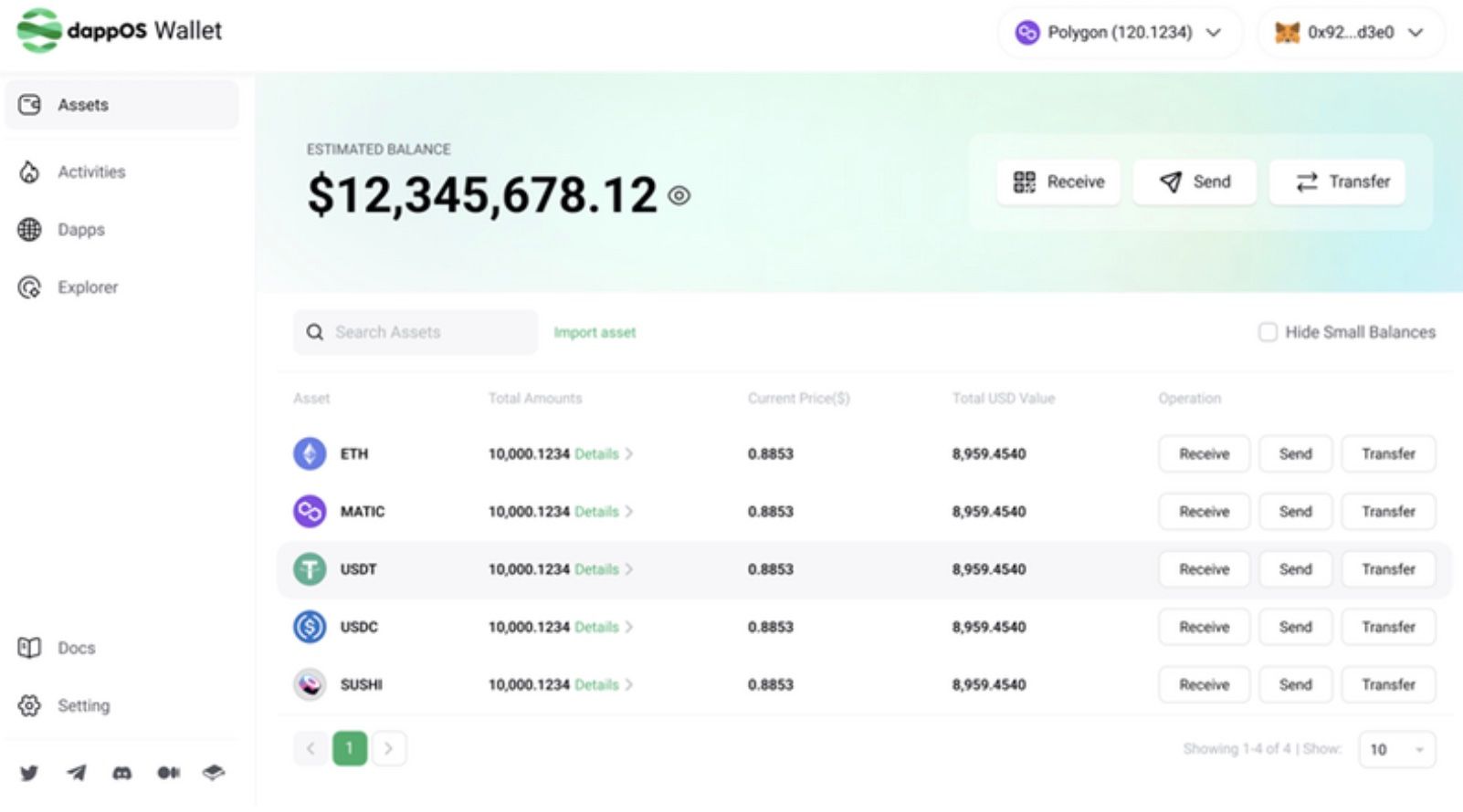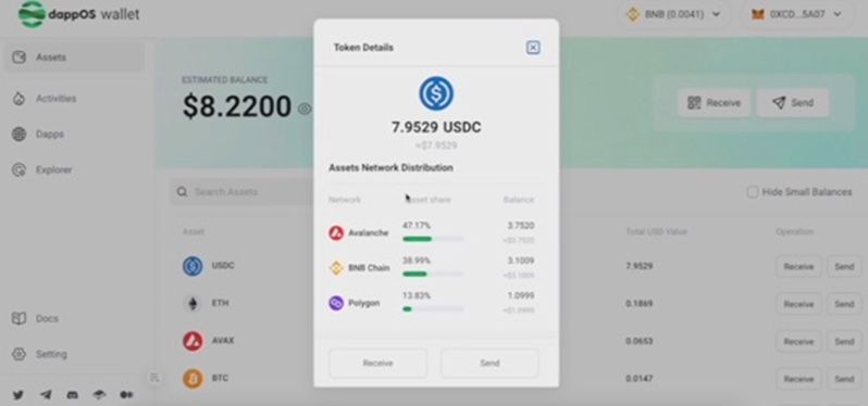 A Look at the dappOS Wallet. Image via dappOSUnder the specific asset balance display, the shown quantity represents the total amount of that asset across multiple blockchain accounts. For example, if it shows approximately 7.95 USDC, this is the combined balance of USDC across Avalanche, BNB Chain, and Polygon blockchains. Expanding this will reveal the actual amounts in each respective multi-chain account.