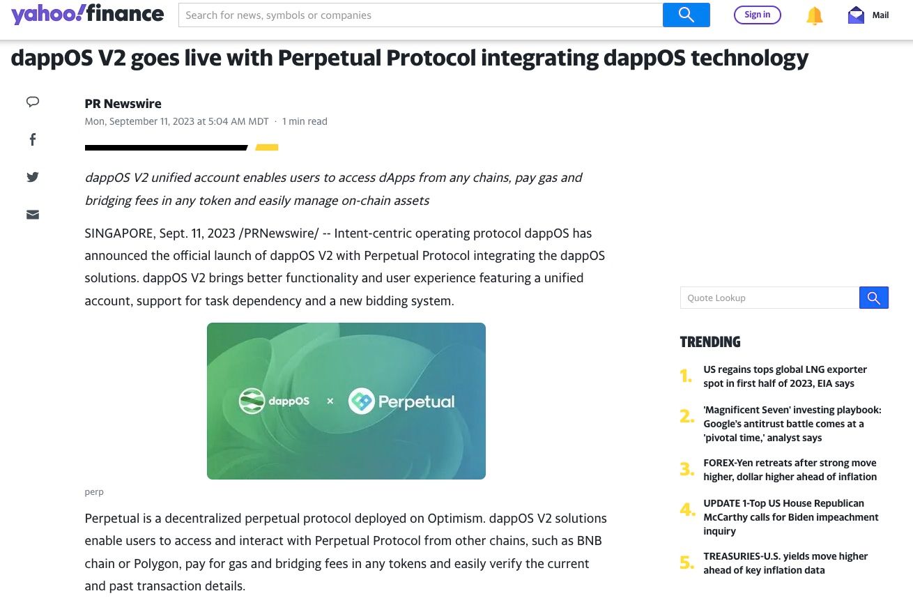 dappOS V2 Goes Live with Perpetual Protocol. Image via Yahoo FinanceThanks to the dappOS features including unified accounts, task dependency and the new bidding system, user experience on Perpetual Protocol has been greatly enhanced, outclassing the experience that exists on other decentralized trading protocols.
