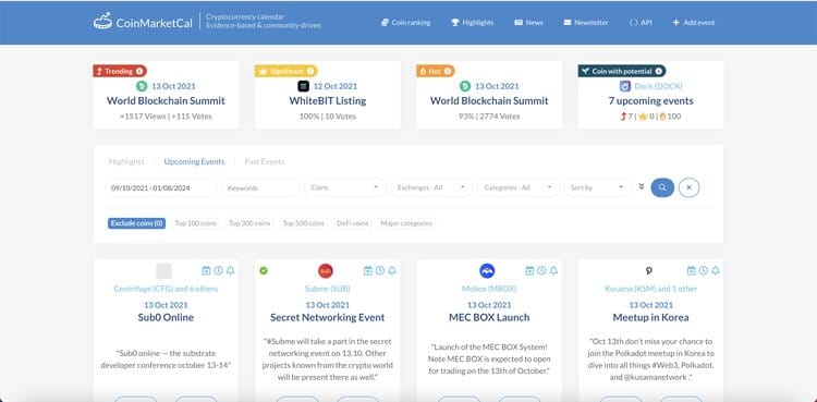 This is perhaps the most comprehensive crypto calendar service out there and if something is happening in crypto, you’ll probably find it here. CoinMarketCal was founded in 2017 and has been growing since. CoinMarketCal features all sorts of events like Reddit AMAs, updates, hard forks, airdrops, listings, and ICOs.
