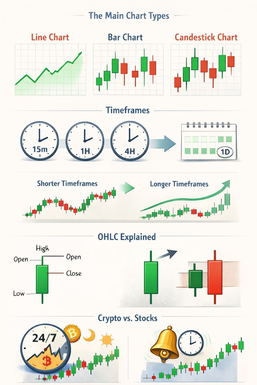 Visual Guide To Crypto Chart Basics, Timeframes, OHLC Structure, And Key Differences From Traditional Stock ChartsThe Main Chart Types