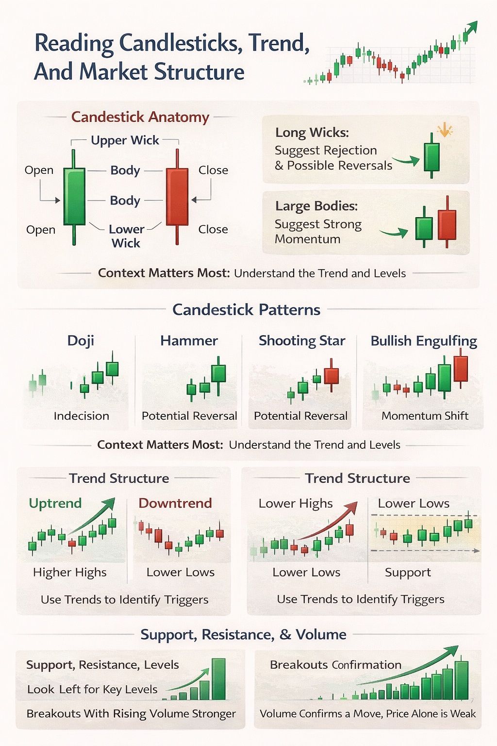 Simple Visual Guide To Reading Candlesticks, Spotting Trend Structure, And Understanding Support, Resistance, And VolumeCandlestick Anatomy