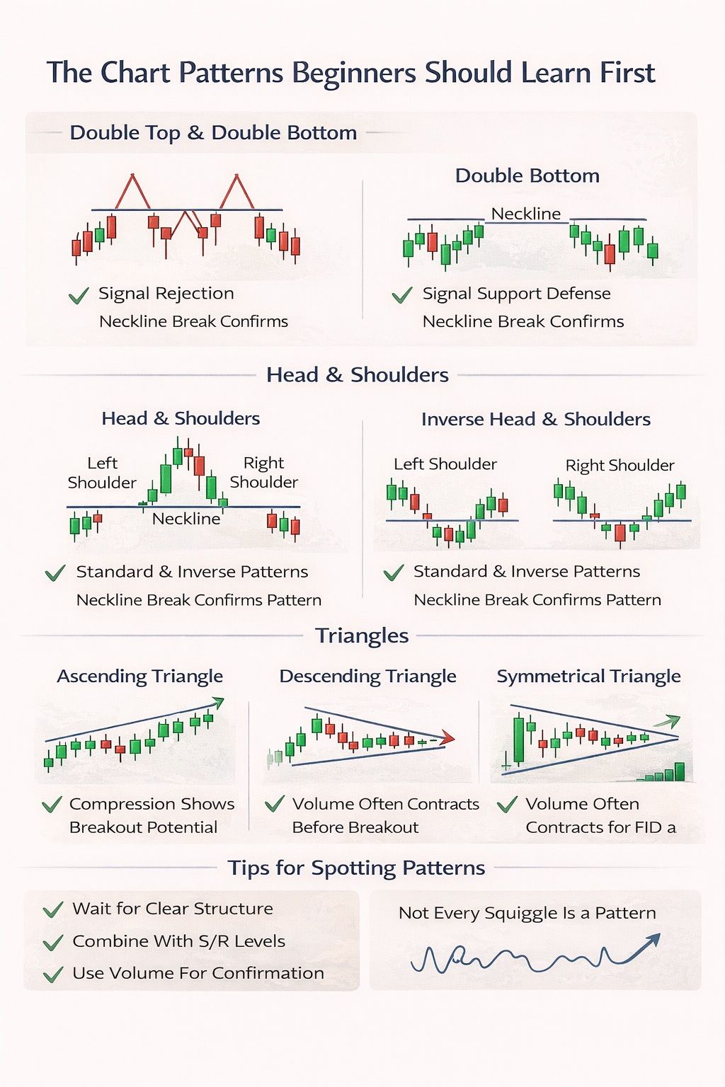 This is the part beginners need to hear most: not every squiggle is a pattern. If you have to stare at the chart and convince yourself the shape is there, it probably is not worth trading. Clean patterns tend to stand out. Forced ones usually fall apart the moment price moves against the idea.