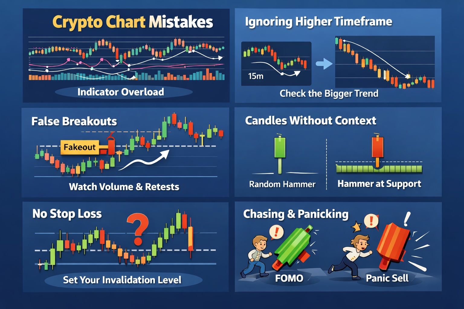 Beginners most often go wrong by overloading charts with indicators, ignoring the higher timeframe, trusting every breakout, and reading candles without enough context. They also tend to enter without a clear invalidation point and let emotion take over by chasing green candles or panic-selling red ones.