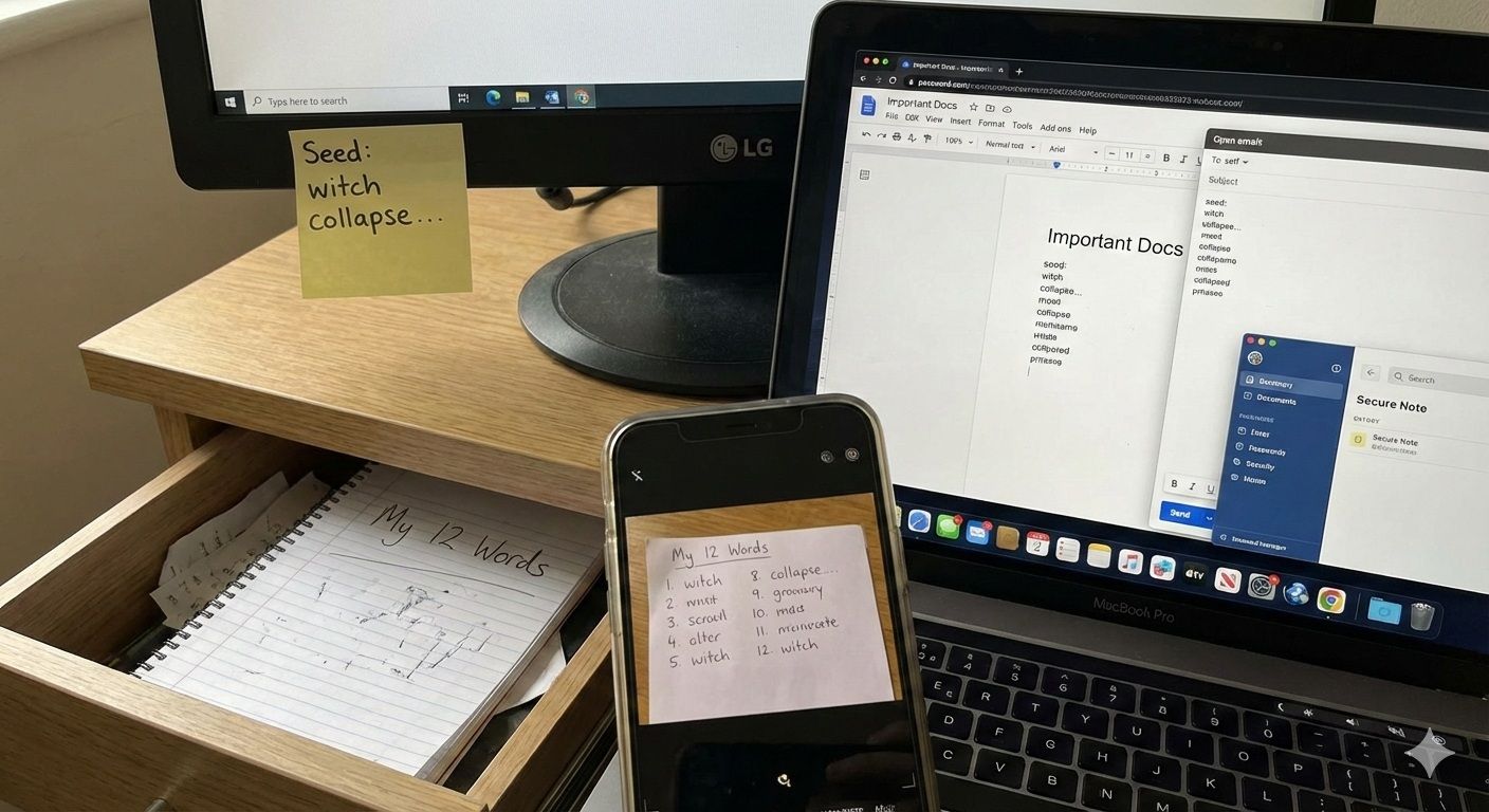 Most seed phrase disasters aren’t flashy hacks, they’re everyday slip-ups: a screenshot that syncs to the cloud, a “temporary” note, a paper copy that’s lost or destroyed, or backups stored in the same place. Take a look at these examples: