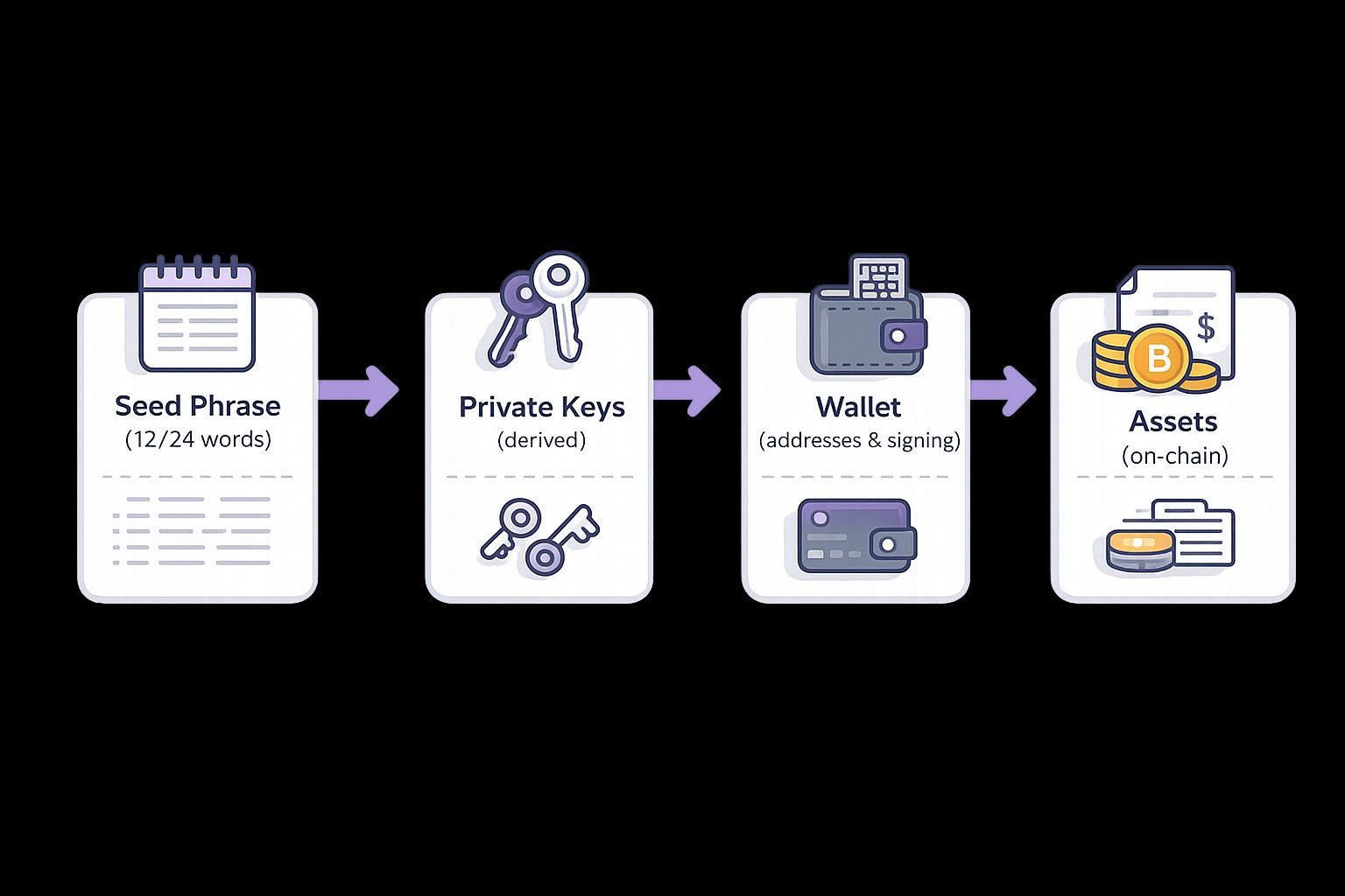 - A seed phrase can regenerate many private keys across accounts and chains.