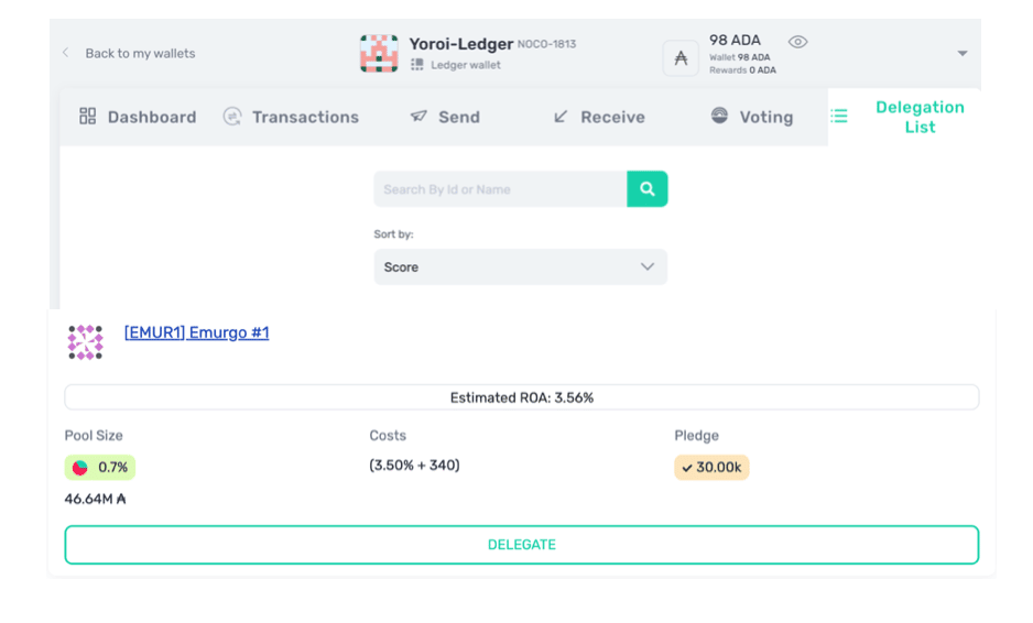 Choose a validator from the Delegation List. Image via YoroiBrowse to the wallet and click on Delegation List. A search field appears where you can enter the name or ID of the validator you want to stake with. When it appears in the list below, click the Delegate button.