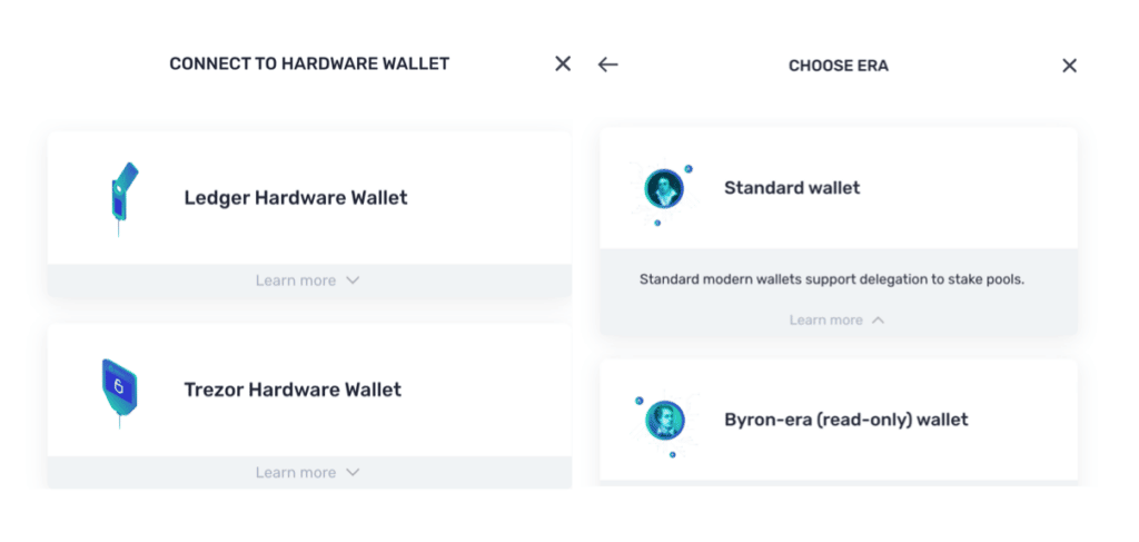 Choose the right wallet to connect with. Image via YoroiFollow the steps to connect with the Ledger wallet. You will be asked to choose between Nano S and Nano X. Ensure that you have connected to the Cardano app on your Ledger. If you have a connection error, check that the "Cardano is ready" message appears on the Ledger device.